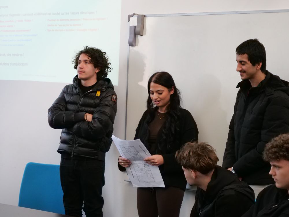 Après une introduction aux risques climatiques (fortes chaleurs, vents, inondations, retrait-gonflement des argiles…), les élèves ont travaillé en groupes sur une étude de cas concrète : leur propre lycée.